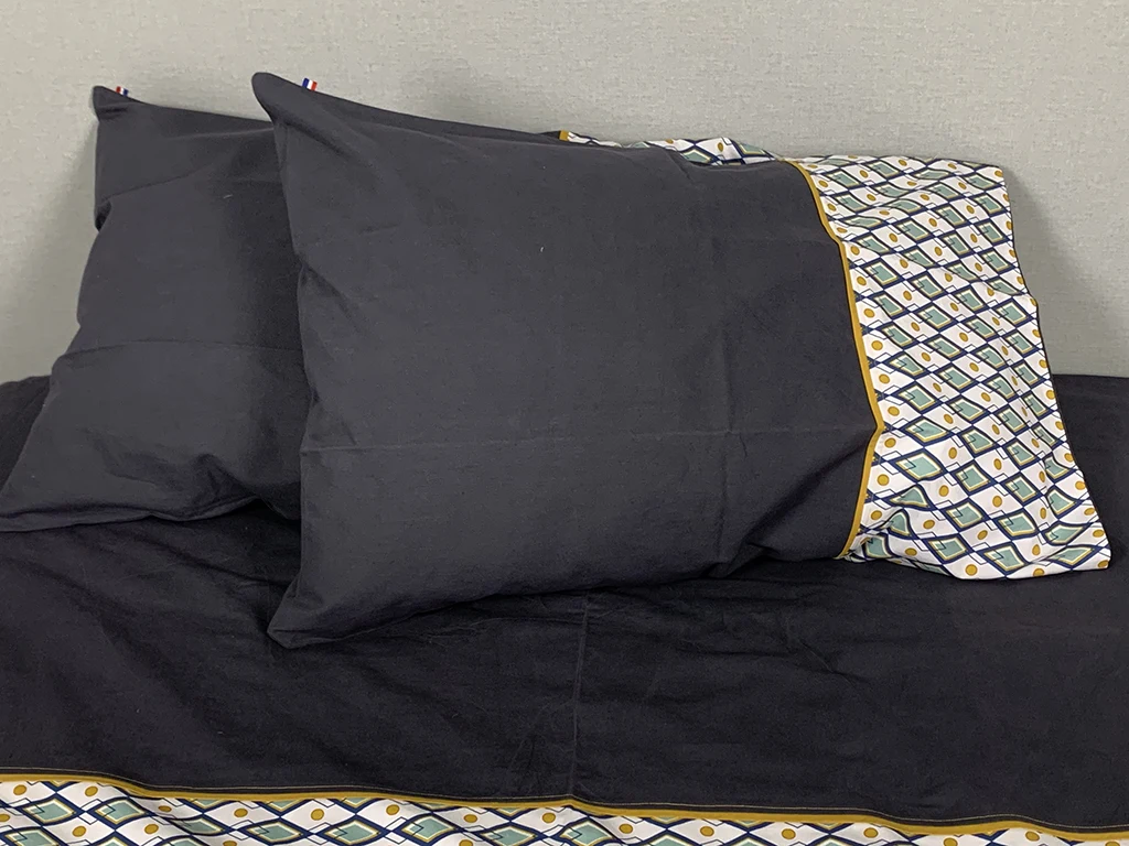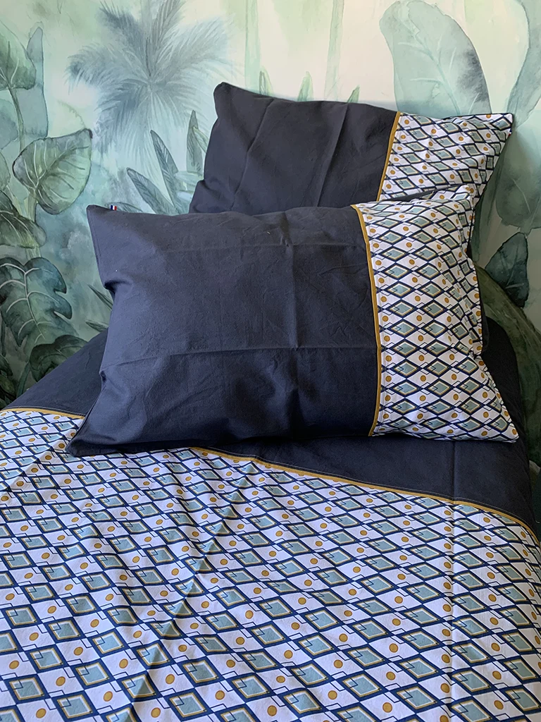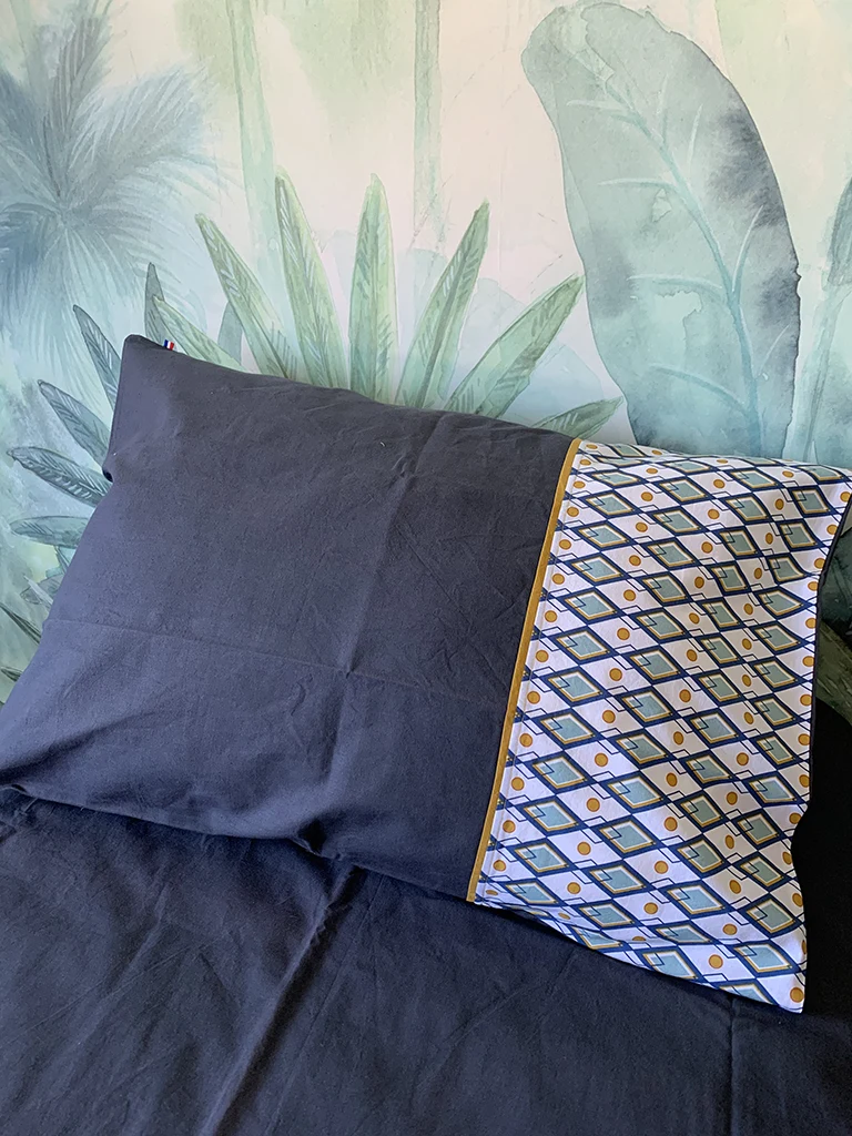 Sa finition est soulignée d’un biais contrastant moutarde pour plus de finesse et son rabat de 19 cm permettra un bon maintien de votre oreiller dans la housse.